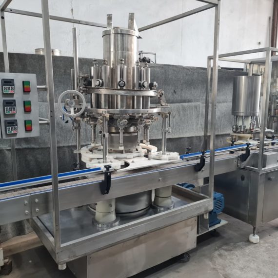 Envasadora com Rosqueadeira Automática para Líquidos, com 7 pistões até 250ml em aço inox AISI 304, rosqueador de tampas com 6 cabeçotes com frição magnética, alimentador vibratório de tampas marca Norma. Produção 5.000 envases/hora, marca Martinez Taboada.  Pronta para produzir.