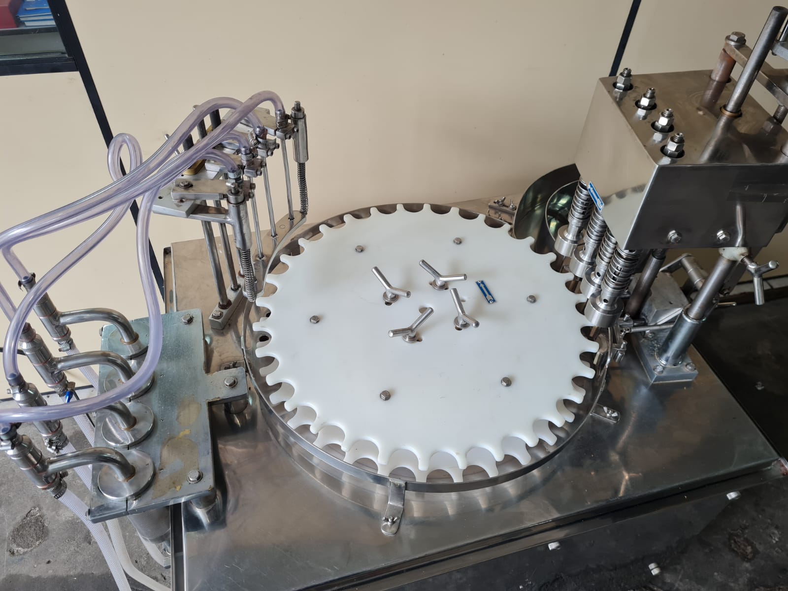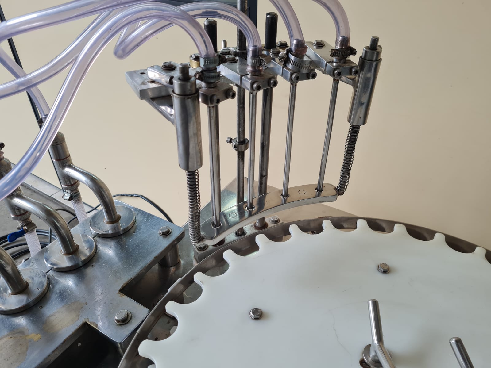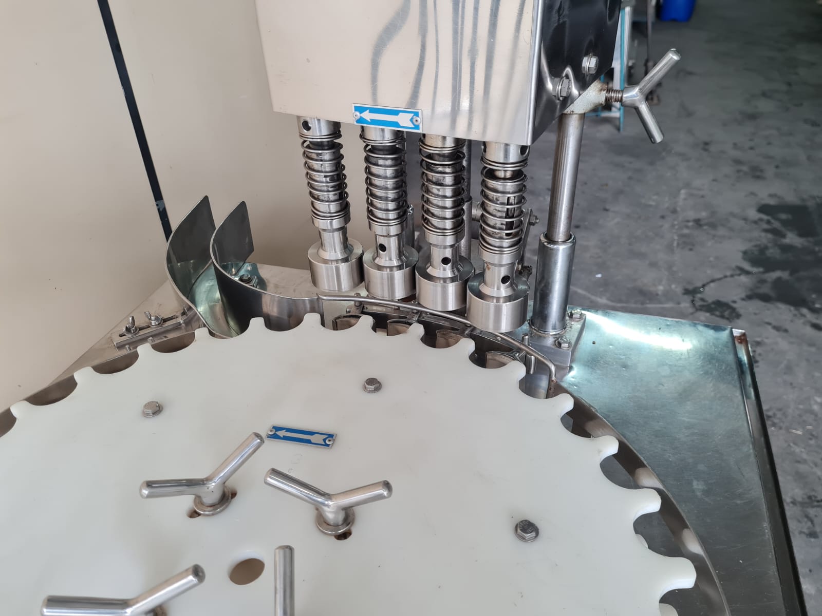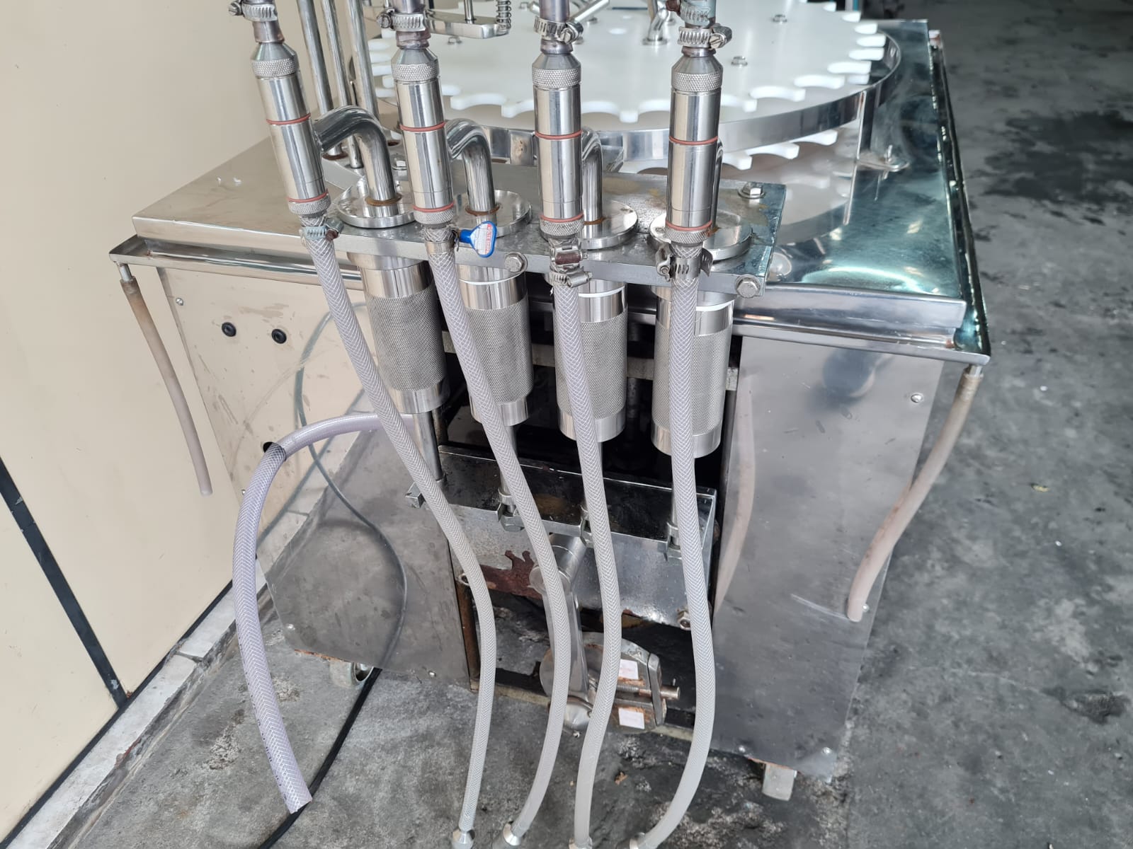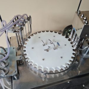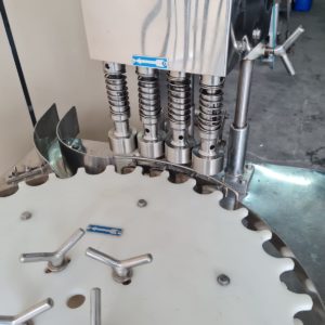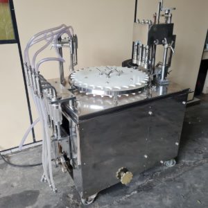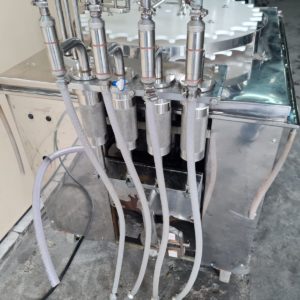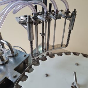 Envasadora Rotativa para líquidos marca ERLI com 4 pistões até 150ml em aço inox AISI304 e 4 cabeçotes rosqueadores com ajuste de torque do aperto da tampa, produção aproximada a 3.000 envases/hora.