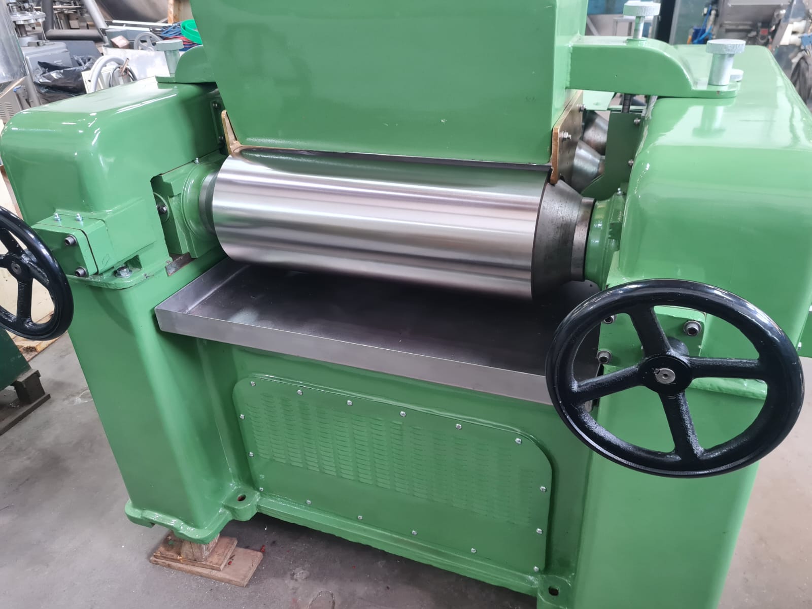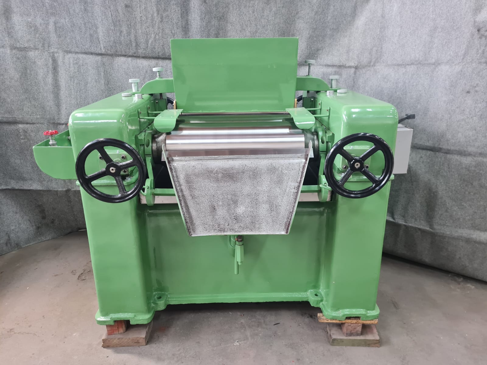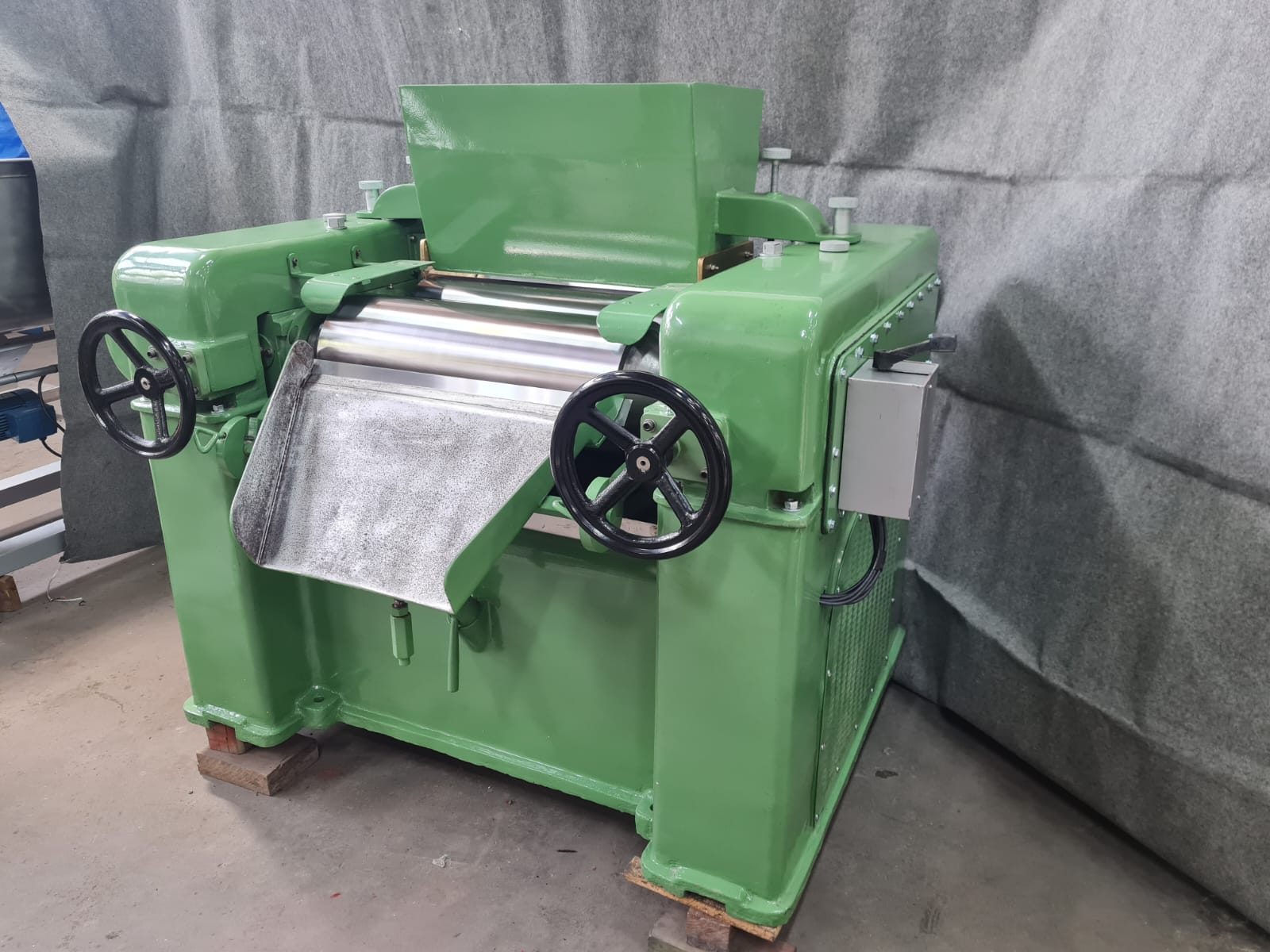 Moinho de 3 Cilindros marca PILON mod. M.C.A. 650, Cilindros de 650mm de comprimento por 250mm de diâmetro úteis, sistema de resfriamento interno dos cilindros, regulagem da aproximação dos cilindros por volante, bandeja em aço inox, motor 15 CV e 860 RPM, cilindros retificados, rolamentos novos de 1ª linha, pintura nova epóxi. Totalmente reformado. Pronto para produzir.